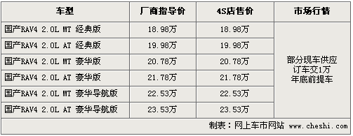 據(jù)一汽豐田北京地區(qū)4S店銷(xiāo)售人員介紹,目前該車(chē)有部分車(chē)型少量現(xiàn)車(chē),由于RAV4貨源比較緊張,大部分車(chē)型及顏色消需要提前預(yù)定,訂車(chē)需要等待2個(gè)月的時(shí)間,也就是要到年底前才可以提到現(xiàn)車(chē)。如果著急購(gòu)買(mǎi),需加價(jià)現(xiàn)金一萬(wàn)元或在4S店購(gòu)買(mǎi)等值的裝飾,F(xiàn)車(chē)顏色以黑色、白色、銀色為主。北京地區(qū)各4S店由于訂單不同,各店銷(xiāo)售的現(xiàn)車(chē)顏色有所不同。