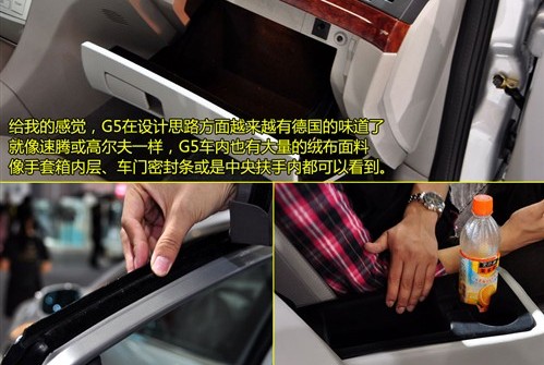 雖然總體感覺還不錯,但真正讓我們徹底認(rèn)可瑞麒G5做工的還是一些細(xì)節(jié)方面的表現(xiàn)。首次前車門門板下端的絨面裝飾比較細(xì)膩,雖然它并沒有太多實際作用,但其意義所在就是用來提升車型的檔次感。同樣我們發(fā)現(xiàn)瑞麒G5在手套箱、中央扶手箱內(nèi)部都鋪墊了絨面內(nèi)襯,手感很有親和力。此外車門上的雙層密封絨布條也讓我們感到有些意外,這讓我們想到以做工精致著稱的大眾速騰。