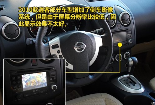 新的逍客在外觀上沒有任何變化,僅僅只在原來6款車身顏色的基礎(chǔ)上增加夢(mèng)幻銀色。更多的變化出現(xiàn)在車輛內(nèi)部的配置上,部分車型增配了倒車影像系統(tǒng),但我們卻認(rèn)為這個(gè)并不實(shí)用,因?yàn)槠聊恢挥?.3英寸,也就是和一般車載導(dǎo)航儀的大小相當(dāng),而且分辨率比較低,所以顯示效果不好。令人費(fèi)解的還有,有了攝像頭之后,逍客卻沒有裝配倒車?yán)走_(dá),其實(shí)大家在倒車的時(shí)候,倒車影像只是作為參考,主要還是依靠倒車?yán)走_(dá)的聲音來判斷距離遠(yuǎn)近,所以沒有倒車?yán)走_(dá)很不方便。