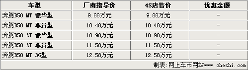 作為一汽奔騰全新家用轎車,與馬自達6同一平臺的奔騰B50,搭載速騰1.6L引擎。推出市場以后,奔騰B50憑借優(yōu)秀的外形設(shè)計和過硬的品質(zhì),受到很多消費者的喜愛。網(wǎng)上車市網(wǎng)站了解到,北京各家經(jīng)銷商處奔騰B50現(xiàn)車顏色不全,購車仍無任何優(yōu)惠。詳情如下: