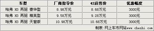 據(jù)長城汽車4S店銷售人員介紹,長城哈弗H3的現(xiàn)車都比較齊全,并且出現(xiàn)了一定的優(yōu)惠幅度。但相比前幾個月,優(yōu)惠幅度卻有所減少,目前購買哈弗H3都可以優(yōu)惠3000元。另外銷售人員表示,長城哈弗H3的廠商指導價只是白色普通漆車型,金屬漆其他顏色車型需要加價2000元。