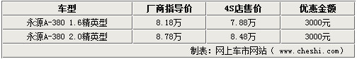 永源汽車旗下的A-380車型在經(jīng)銷商處現(xiàn)可給出3000元的現(xiàn)金優(yōu)惠。經(jīng)銷商表示,現(xiàn)在店內(nèi)的1.6L及2.0L車型均可滿足消費(fèi)者購(gòu)車的需要,顏色也比較齊全。