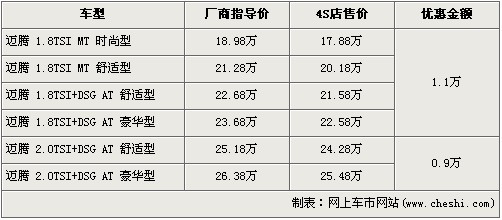 據(jù)北京一汽大眾經(jīng)銷店銷售人員介紹,邁騰全系車型全系優(yōu)惠1.1萬元。經(jīng)1.1萬元的優(yōu)惠后,全系入門級的1.8TSI MT時(shí)尚型的售價(jià)從18.98萬元下降到了17.88萬元。全系最高配的邁騰2.0TSI豪華版經(jīng)9000元優(yōu)惠后,售價(jià)降到了25.48萬元。銷售人員還介紹,目前邁騰全系現(xiàn)車都比較充足。