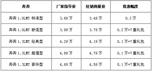如果說,10萬元左右的緊湊型家用車是合資品牌的必爭之地,那么,5萬元以下的微型車就是自主品牌的天下了。雖然有F0和熊貓、QQ這一系列大敵當(dāng)前,但奔奔在昆明市場還是占有一席之地的。近日,車天下編輯從云南萬友長安汽車經(jīng)銷商處獲悉,奔奔系列有1000-2000元不等的現(xiàn)金優(yōu)惠,同時(shí)還可獲得萬友送出的7重大禮包。