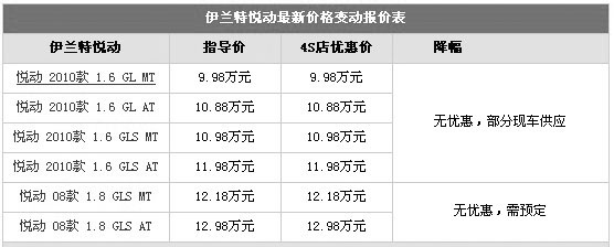 2010款悅動目前僅推出1.6一種排量4款車型在售。GL版配備了ABS/EBD和前排雙安全氣囊等安全裝置,同時標(biāo)配電動車窗、后視鏡電動調(diào)節(jié)和單碟CD等配置。GLS版則在舒適版的基礎(chǔ)上增加了電動天窗和多功能方向盤等配置,并對輪胎進行了升級。