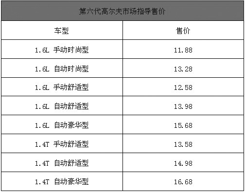 2009年10月19日,結束了歐亞大陸的長途跨越,完成了對完美城市的探尋與交融,人們期待已久的第六代高爾夫終于在長春正式宣布上市。第六代高爾夫共推出了1.6L和1.4TSI兩種排量、八款車型供消費者選擇,兩種排量的發(fā)動機都可匹配7速DSG雙離合自動變速箱和5擋手動變速箱,售價11.88萬-16.68萬元,具體售價如下表:第六代高爾夫市場指導售價