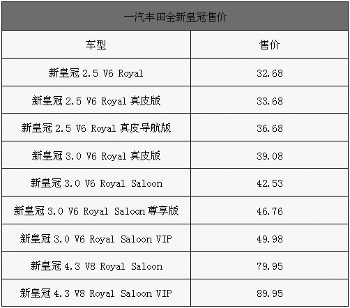 2009年12月14日,一汽豐田全新CROWN皇冠在北京公布售價(jià)并宣布正式上市,此次上市共推出2.5L、3.0L和4.3L三種排量共9款車(chē)型,并有五種車(chē)身顏色和兩種內(nèi)飾顏色可選,售價(jià)32.68-89.95萬(wàn)元,具體售價(jià)如下表:一汽豐田全新皇冠售價(jià)