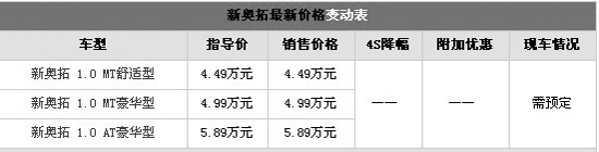 目前新奧拓有3款車型在售,其中手動舒適型標配ABS/EBD和前排雙安全氣囊安全裝置,同時配置后霧燈以及前門電動車窗等配置;手動豪華版在舒適型的基礎上增加了遙控鑰匙、鋁合金輪轂、真皮座椅、單碟CD、前霧燈以及后門車窗電動調節(jié)等人性化配置;而自動豪華版和手動豪華版的配置相同。