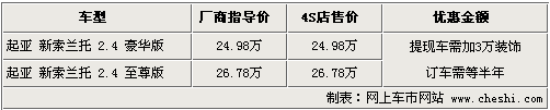 據(jù)進(jìn)口起亞4S店銷售人員介紹,新索蘭托訂單持續(xù)增加,如客戶著急提車,需在店內(nèi)加裝3萬元裝飾,裝飾包括:腳墊、貼膜、地膠、封釉、加不銹鋼保險杠等。預(yù)訂需要交納1萬元訂金,6月份可提到現(xiàn)車,F(xiàn)車顏色根據(jù)近期到車顏色而定。