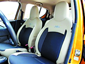 新奧拓采用了全新的中控臺設(shè)計元素,雙色內(nèi)飾使整個內(nèi)部空間層次分明。儀表盤的樣式很別致,在傳統(tǒng)的儀表盤上只有一個大大的圓形速度表盤,轉(zhuǎn)速表被單獨“提”了出來,布置在儀表臺的左上方。儀表臺、前門板以及座椅都體現(xiàn)了雙色風格,加上濃郁的設(shè)計元素,整個內(nèi)飾空間給人一種清新明快的感覺。運用三種不同面料縫制的座椅頗具運動感,造型設(shè)計比較符合人體工程學,頭枕和椅背采用一體式設(shè)計,能貼合乘坐者的頭、背及腰部曲線以提供良好的駕乘感受。