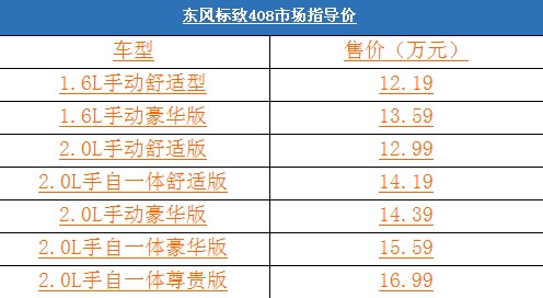 1月25日,東風(fēng)標(biāo)致408在北京全球首發(fā)上市,共推出1.6L和2.0L排量7款車(chē)型,售價(jià)12.19-16.99萬(wàn)元。這是標(biāo)致汽車(chē)品牌創(chuàng)立120年以來(lái),首次在海外市場(chǎng)全球首發(fā)其最新一代車(chē)型。這不僅顯示出中國(guó)市場(chǎng)日漸提升的重要地位,更凸顯標(biāo)致汽車(chē)乃至PSA標(biāo)致雪鐵龍集團(tuán)的中國(guó)戰(zhàn)略重心的進(jìn)一步確立。具體售價(jià)如下表: