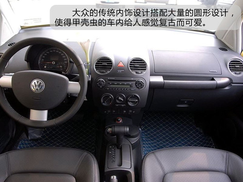 甲殼蟲的內(nèi)飾具有很明顯的大眾特征,各種開關(guān)、按鍵對于經(jīng)常駕駛大眾車輛的人來說是十分熟悉的。最特別的就是圓桶形的大儀表,速度表最大,幾乎占據(jù)了整個儀表盤面,中部是行車電腦,置于下方的是油表和轉(zhuǎn)速表。