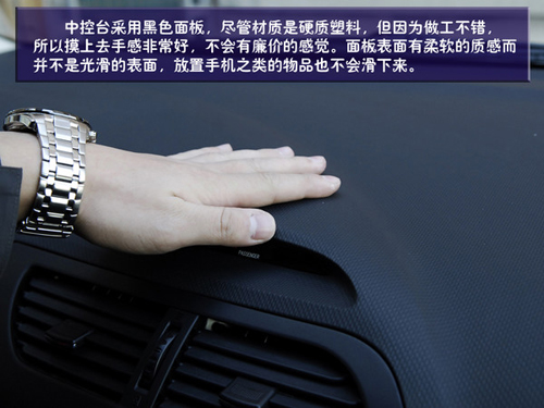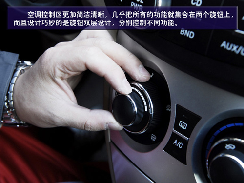空調(diào)控制區(qū)就更加簡潔了,幾乎把所有的功能就集合在兩個旋鈕上,而且設(shè)計(jì)巧妙的是旋鈕雙層設(shè)計(jì),分別控制不同功能。但在使用時我們發(fā)現(xiàn)旋鈕的指示標(biāo)是一個小的凹槽,在光線不足是可以看到是一個小燈,但在白天時這個凹槽并不十分明顯,可能會造成讀取的小障礙。