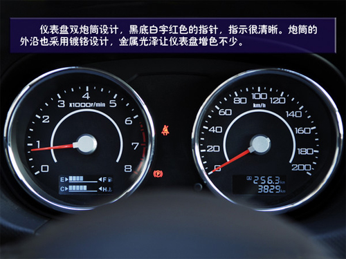 儀表盤雙炮筒設(shè)計(jì)與運(yùn)動風(fēng)格相統(tǒng)一,黑底白字紅色的指針,指示很清晰。炮筒的外沿也采用了鍍鉻設(shè)計(jì),金屬光澤讓儀表盤增色不少。轉(zhuǎn)速表的炮筒內(nèi)集成油箱和水溫表,用方格來顯示。時速表炮筒內(nèi)集成公里計(jì)數(shù),而這里顯示的分別是總里程和短時里程,不需要切換,讀取更方便。