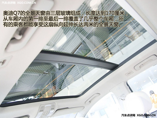 作為奧迪旗下的第一款SUV車型,奧迪理所當(dāng)然的為我們帶來了豪華的全景天窗配置。這個(gè)被稱為“Open Sky”的全景天窗,由三層玻璃組成,長度達(dá)到170厘米,從車廂內(nèi)的第一排至最后一排覆蓋了幾乎整個(gè)車廂,所有的乘客都能享受這扇縱向延伸長達(dá)兩米的全景天窗。