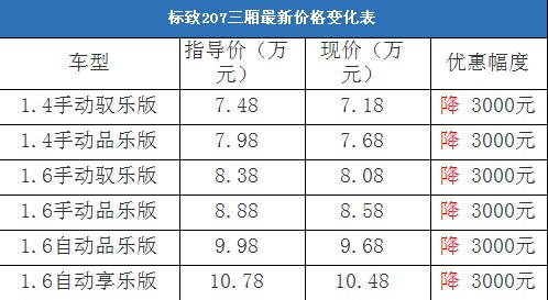近日,編輯從東風標致4S經銷商處了解到,標致207的現車充足,顏色也比較全,有紅、銀、灰、藍色現車。目前購買標致207可以優(yōu)惠3000元現金,并且在此優(yōu)惠的基礎上還有價值3000元的導航、裝飾禮包贈送。據經銷商透露,贈送的禮包可以折現,但是需要消費者到店與經銷商詳談才可以確定。以下是標致207最新價格變化表: