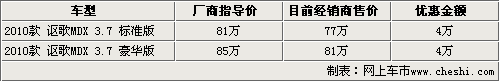 據(jù)北京地區(qū)謳歌4S店銷售人員透露,謳歌2010款MDX現(xiàn)車均已到店,車源比較充足。現(xiàn)在購車不僅可以享受到4萬元的現(xiàn)金優(yōu)惠外,還可以得到商家贈送的原廠汽車裝飾。部分顏色車型需要提前預定,訂貨周期在一周左右。目前北京地區(qū)有三家謳歌4S店,消費者在購買前可以多去幾家4S店。