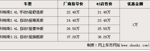 據(jù)雪弗蘭科經(jīng)銷(xiāo)商銷(xiāo)售人員介紹,消費(fèi)者于近期購(gòu)買(mǎi)雪佛蘭-科帕奇任意一款車(chē)型,可以得到1萬(wàn)元的現(xiàn)金優(yōu)惠,2.4L排量高配的七座手自一體豪華版經(jīng)優(yōu)惠后售價(jià)為25.58萬(wàn)元,而低一級(jí)的2.4L手動(dòng)五座舒適版經(jīng)優(yōu)惠后售價(jià)降為21.48萬(wàn)元。頂級(jí)的3.2L自動(dòng)7座旗艦版經(jīng)優(yōu)惠后,售價(jià)從37.28萬(wàn)元下降到了36.28萬(wàn)元。