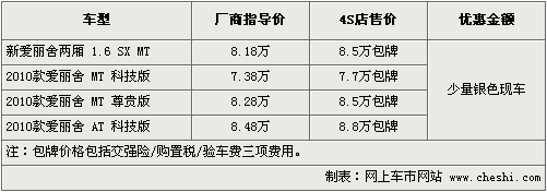 據(jù)東風(fēng)雪鐵龍4S店銷售人員介紹,目前愛麗舍全系車型均為包牌銷售,其中兩廂包牌價(jià)8.5萬元,三廂三款車型包牌價(jià)分別為7.7萬元,8.5萬元以及8.8萬元。包牌價(jià)分別包括了交強(qiáng)險(xiǎn),購置稅和驗(yàn)車費(fèi)。對消費(fèi)者而言節(jié)省了不少的費(fèi)用,F(xiàn)車方面只有極少量手動科技版現(xiàn)車,顏色以銀色為主。其它車型及顏色需要預(yù)定,訂金1千元,2周左右可以提到車。北京地區(qū)各4S店由于訂單不同,各店銷售的現(xiàn)車顏色有所不同。