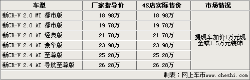 東風本田旗下的CR-V車型自上市以來,一直以其較高的性價比占領著國內家用SUV市場的半壁江山,提現(xiàn)車的加價銷售從CR-V上市之日起持續(xù)到了現(xiàn)在,CR-V的暢銷為同級別車型樹立了典范。3月5日東風本田正式推出全新的CR-V,在售價不變的情況下對全系車型進行了配置升級,并推出了導航版車型。那么新車上市后的市場行情是什么樣子呢?根據(jù)網上車市價格監(jiān)測系統(tǒng)顯示,全新上市的CR-V依然存在加價售車的現(xiàn)象。具體車型售價見下表: