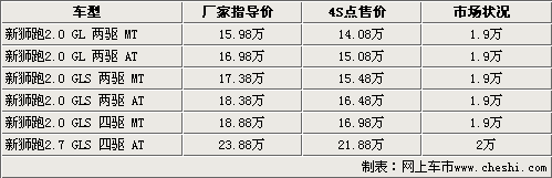 東風(fēng)悅達(dá)起亞獅跑和北京現(xiàn)代途勝屬于同平臺(tái)車型,但相比途勝,獅跑外觀更有活力,F(xiàn)售的09款獅跑,時(shí)尚的外觀和改款后配置的重新升級(jí),使獅跑在同級(jí)別中的性價(jià)比進(jìn)一步提升。近日根據(jù)網(wǎng)上車市價(jià)格監(jiān)測系統(tǒng)顯示,目前獅跑最高優(yōu)惠達(dá)到2萬元,其中2.0和2.7的四驅(qū)車型需要提前預(yù)定。具體車型售價(jià)見下表: