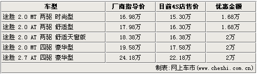 北京現(xiàn)代途勝是韓系車中非常經(jīng)典的一款城市型SUV,寬大的空間,時尚的外觀以及人性化的配置使眾多消費者都鐘情它。據(jù)網(wǎng)上車市價格監(jiān)測系統(tǒng)顯示:目前購買途勝的消費者最高可享受到2萬元的現(xiàn)金優(yōu)惠。具體車型見下表: