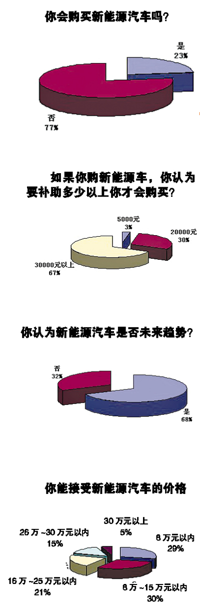 就新能源汽車目前的現(xiàn)狀,記者向近100位讀者做了調(diào)查,很多消費(fèi)者在接受調(diào)查時(shí)表示,新能源車的技術(shù)還不成熟,但是目前的新能源車價(jià)格卻很高,對(duì)于普通的消費(fèi)者來說,還不如買一部普通的用油小車。