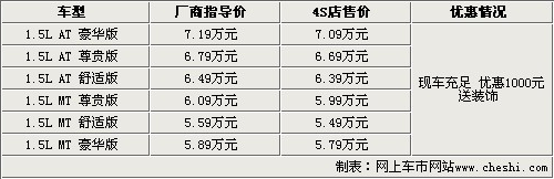 據(jù)長安汽車4S店銷售人員介紹,目前兩廂版悅翔現(xiàn)車比較齊全,不過部分顏色現(xiàn)車較少,有意購買的朋友還需從速,全系車型優(yōu)惠1000元。如有時間到店看車詳談,除了基本優(yōu)惠外還可以贈送裝飾。
