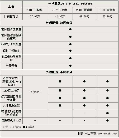 國產(chǎn)奧迪Q5全系均安裝了全景天窗,在車型均安裝了鋁飾行李架軌道,并且前風(fēng)擋以及側(cè)窗都安裝了帶有隔熱功能的吸能玻璃,愛美的女車主可以不必在為了怕曬黑自己,而涂上厚厚一層的防曬霜了。除了入門級(jí)的進(jìn)取型之外,其他三款車型均安裝了帶有LED日間行車燈的雙氙氣前大燈,并且?guī)в星按鬅羟逑垂δ,LED尾燈也安裝上身。雖然進(jìn)取型沒有標(biāo)配這些配置,不過只要您愿意,花費(fèi)9000元這些配置同樣可以選裝上身。頂配的豪華版車型上,自適應(yīng)式前大燈可以比其他三款車型給駕駛員提供更人性化更廣闊的視野范圍。