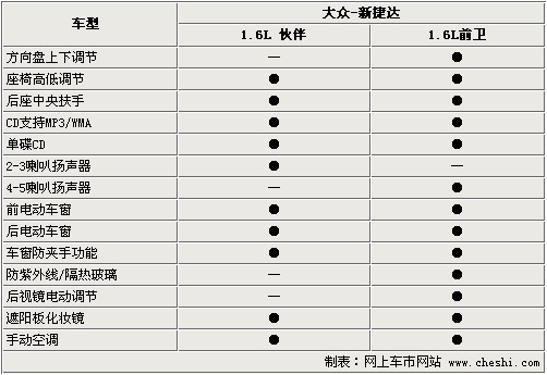 新推出的兩款車(chē)型保證了基本的舒適性及娛樂(lè)性,座椅高低調(diào)節(jié)及后排中央扶手提供了基本的配置。支持MP3/WMA的單碟CD音響方便了使用,兩款車(chē)只是在喇叭數(shù)量上有所區(qū)別。全車(chē)標(biāo)配電動(dòng)門(mén)窗,對(duì)于捷達(dá)較低的價(jià)格而言也算難能可貴。但方向盤(pán)上下調(diào)節(jié)、防紫外線(xiàn)/隔熱玻璃、后視鏡電動(dòng)調(diào)節(jié)在伙伴上并沒(méi)有出現(xiàn)?梢钥闯觯瑥S(chǎng)家對(duì)于這款經(jīng)濟(jì)型轎車(chē)的成本控制還是很?chē)?yán)格的。