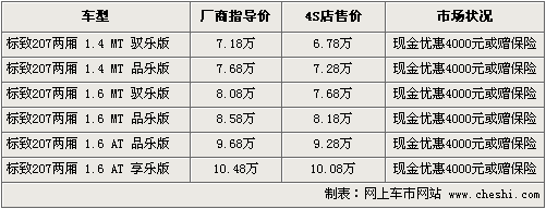 標(biāo)致207系列在推出限量版車(chē)型后,一直備受消費(fèi)者關(guān)注。兩廂207在繼承了三廂車(chē)型優(yōu)點(diǎn)的同時(shí),又添加了許多運(yùn)動(dòng)因素,更適合年輕時(shí)尚的消費(fèi)者。根據(jù)網(wǎng)上車(chē)市價(jià)格監(jiān)測(cè)系統(tǒng)顯示,目前207兩廂可以優(yōu)惠現(xiàn)金4000元,或選擇贈(zèng)送4項(xiàng)保險(xiǎn)及大禮包。具體車(chē)型行情如下: