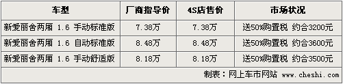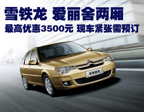 東風雪鐵龍愛麗舍從9月份開始,對車型進行了一次全面升級。2010款新愛麗舍在安全、舒適、節(jié)油和性能方面比老款有增加了相應的配置,進一步強化了新愛麗舍成熟的產品品質。而09款兩廂愛麗舍更具城市便利性,其備箱空間絲毫不亞于三廂車型,是繼富康后的又一經(jīng)典兩廂叫用車。根據(jù)網(wǎng)上車市價格監(jiān)測系統(tǒng)顯示,目前購買愛麗舍兩廂,可享受購置稅減半,折合最高優(yōu)惠約3600元。具體車型價格行情如下: