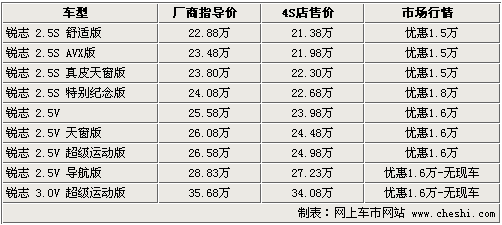 豐田銳志作為一款以運(yùn)動(dòng)著稱的后驅(qū)中級(jí)車(chē),在性能以及操控各方面表現(xiàn)都令人滿意,尤其是獨(dú)具個(gè)性的改裝潛力,讓很多癡迷運(yùn)動(dòng)的車(chē)迷們找到了充分的駕 駛樂(lè)趣。銳志配備有2.5L和3.0L兩種排量的發(fā)動(dòng)機(jī),同時(shí)超長(zhǎng)的軸距設(shè)計(jì)讓乘員的空間也有了非常理想的狀態(tài)。近日根據(jù)網(wǎng)上車(chē)市價(jià)格監(jiān)測(cè)系統(tǒng)顯示,目前 購(gòu)買(mǎi)銳志車(chē)型,最高可享受到1.8萬(wàn)元的現(xiàn)金優(yōu)惠。具體車(chē)型見(jiàn)下表: