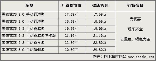 東風(fēng)雪鐵龍C5秉承了雪鐵龍先進(jìn)的創(chuàng)新理念和完美的制造工藝,從外觀到內(nèi)飾的做工充分體現(xiàn)了這款中級車的內(nèi)在價(jià)值。同時(shí)一系列高端配置以及車身安全性方面均有不俗的表現(xiàn)。根據(jù)網(wǎng)上車市價(jià)格監(jiān)測系統(tǒng)顯示,目前C5全系都有現(xiàn)車供應(yīng),車價(jià)方面無任何優(yōu)惠。