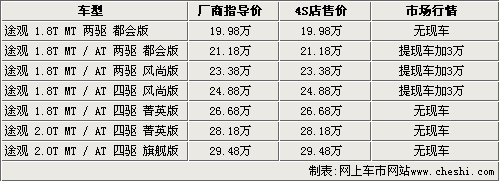 據(jù)北京地區(qū)上海大眾4S店銷售人員介紹,目前國(guó)產(chǎn)途觀已經(jīng)有部分車型抵達(dá)4S店展廳,其中包括手自一體都會(huì)版、兩驅(qū)風(fēng)尚版和四驅(qū)風(fēng)尚版,消費(fèi)者如果提現(xiàn)車的話,需要加價(jià)3萬(wàn)元。該銷售人員表示,如果不加價(jià)預(yù)訂的話,需要半年才能提到現(xiàn)車。部分4S店表示,目前途觀有些現(xiàn)車是為已預(yù)訂的消費(fèi)者準(zhǔn)備,如果該消費(fèi)者退訂單,其他消費(fèi)者也可以加價(jià)3萬(wàn)元提走該現(xiàn)車。
