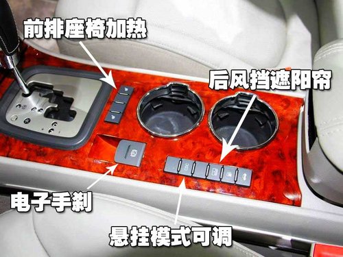 在換擋桿后部的控制區(qū)應(yīng)該說是瑞麒G6前排的亮點所在,首先電子手剎出現(xiàn)在G6上,座椅加熱這一冬天的貼心裝備也在這個位置,除此之外,瑞麒G6還帶有懸架調(diào)節(jié)控制,有三種模式供給駕駛員選擇,同時商務(wù)車裝備的后窗遮陽簾也是標(biāo)配。