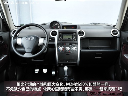 哈弗M2的內(nèi)飾與酷熊保持了高度的一致,看到這個(gè)造型難免讓人想到豐田XB,只不過長(zhǎng)城模仿的是大部分人都不知道的車型。當(dāng)然,造型一致并不意味著沒有變化,比如M2在的金屬踏板是酷熊沒有的,它既增加了視覺效果又對(duì)防滑起到積極意義,車門的內(nèi)襯顏色也升級(jí)為新的黑紅搭配的網(wǎng)格材料。