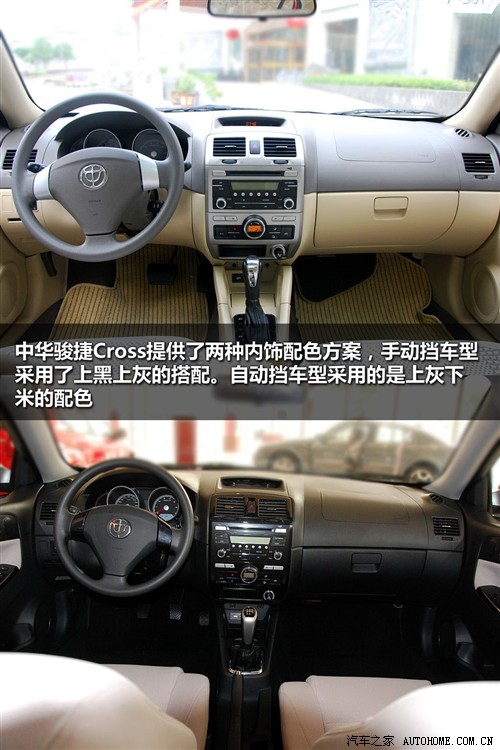 與個性的外觀相比,駿捷Cross在內(nèi)飾上似乎并沒有體現(xiàn)出什么特點,呈現(xiàn)的一派典型的轎車化風格,做工在自主品牌里面算是比較出色的,而且樣式也絕對不亞于同價位的合資車型,其中手動擋車型采用的是上黑下灰的配色方案,而自動擋車型則為更接近結(jié)局的上灰下米的色彩搭配。