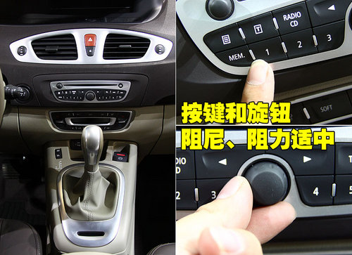 雷諾新風(fēng)景的中控臺面板屬于時尚、簡潔的類型。中控臺的各按鍵、旋鈕在使用中各項調(diào)節(jié)功均能準確到位,音響控制面板按鍵大小適中,方便乘客操作。