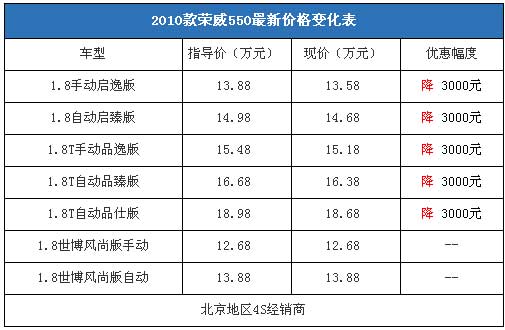 近日,編輯從北京地區(qū)上汽汽車4S經(jīng)銷商處了解到,榮威550全系車型的現(xiàn)車比較充足,購車可以優(yōu)惠3000元左右。據(jù)經(jīng)銷商介紹,在春節(jié)期間推出的榮威550賀歲版在世博會(huì)到來之際改名為“世博風(fēng)尚版”繼續(xù)銷售,因?yàn)橘R歲版車型的性價(jià)比較高,沒有大幅度的現(xiàn)金優(yōu)惠。店內(nèi)銷售人員介紹,如果不需要現(xiàn)金優(yōu)惠,消費(fèi)者在店內(nèi)可獲贈(zèng)世博版大禮包,有機(jī)會(huì)免費(fèi)參加上海世博會(huì)。