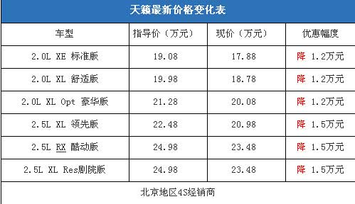 近日我們從東風(fēng)日產(chǎn)北京海潤嘉4S經(jīng)銷商處了解到,天籟的現(xiàn)車充足,顏色也比較全,不過以銀色和黑色為主。如果部分車型需要預(yù)定,等待的時間為1個月左右,定金為2000元。目前2.0L排量車型可以優(yōu)惠1.2萬元,2.5L排量車型可以優(yōu)惠1.5萬元。