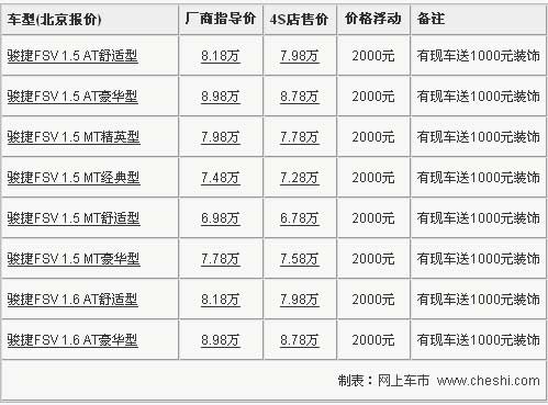 駿捷FSV共有8款車型在售,分為1.5 L和1.6L兩種排量,價(jià)格范圍是6.98-8.98萬元。據(jù)4S店銷售人員介紹,目前全系車型在廠商指導(dǎo)價(jià)的基礎(chǔ)上現(xiàn)金優(yōu)惠2000元,此外還贈(zèng)送價(jià)值1000元的裝飾大禮包,車型顏色比較齊全,如果感興趣的朋友可聯(lián)系經(jīng)銷商。