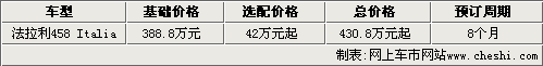 據法拉利北京展廳銷售人員介紹,目前法拉利458 Italia已經有展車抵達展廳,消費者可隨時到店看車。而且法拉利458 Italia已經開始接受預訂,起價為388.8萬元,消費者如果預定這款新車,至少要選裝42萬元的配置,總價格為430.8萬元起。另外,消費者如果現(xiàn)在下訂單的話,需要在明年1月份才能提到現(xiàn)車。