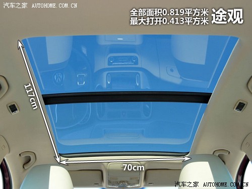途觀的天窗和大眾以往其他的電動天窗秉承一樣的設(shè)計(jì),一鍵式開啟時(shí),天窗并不能一直打開到底,這個時(shí)候打開的長度大概為46cm,再擰一下旋鈕,天窗會繼續(xù)向后打開,此時(shí)打開的長度為59cm,全部可打開的面積達(dá)到0.413平方米。此外,在打開方式中還有一種換氣模式,跟前面說過的Q5一樣,前天窗會翹起,形成一個開口,用來起到換氣的作用,只是看起來比較窄而已。