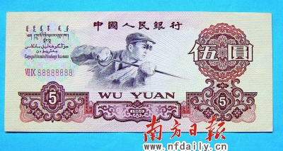被收藏界稱(chēng)為“豹號(hào)”的8個(gè)“8”連號(hào)人民幣現(xiàn)身云浮。日前,來(lái)自該市羅定的民間收藏家王河先生向記者展示其收藏的8個(gè)“8”連號(hào)的人民幣,該幣為1960年版的第三套人民幣5元紙幣,已退出流通領(lǐng)域。據(jù)了解,該5元幣曾獲世界紙幣設(shè)計(jì)金獎(jiǎng)。8個(gè)“8”的吉祥號(hào)碼被收藏界稱(chēng)之為“豹號(hào)”,向來(lái)難得一見(jiàn),目前已有來(lái)自茂名的收藏愛(ài)好者開(kāi)價(jià)88888元求購(gòu)。(記者/楊紅雨特約通訊員/廖榮波)