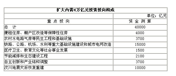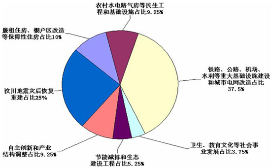 為了應(yīng)對金融危機,2008年底,我國在出臺促進經(jīng)濟平穩(wěn)增長、改善民生、調(diào)整結(jié)構(gòu)的一攬子計劃,并確定了防止資金被擠占挪用的檢查督察機制,以及引導(dǎo)民間資本擴大投資的方針政策。這項計劃涉及總投資4萬億元,包括中央投資總額為11800億元。