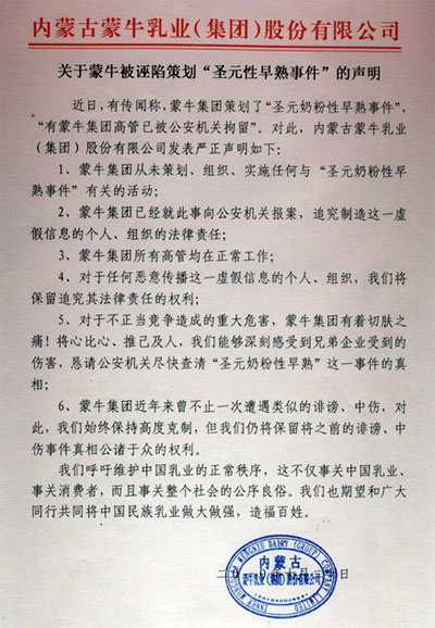 在蒙牛公司發(fā)表的題為《關于蒙牛被“誣陷”策劃“圣元性早熟事件”的聲明》一文里,蒙牛公司稱,“蒙牛集團從未策劃、組織、實施任何與圣元奶粉性早熟事件有關的活動”;“蒙牛集團所有高管均正常工作”。