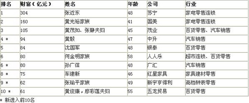 據(jù)介紹,今年零售榜共有6位新上榜富豪,行業(yè)分布可謂百花齊放,從汽車銷售商:如中升集團的黃毅(財富94億排名第5)和李國強(財富57億排名第10);到家具建材零售商:如紅星家具的車建新(財富75億排名第8);到區(qū)域型百貨零售商:如五龍貿(mào)易的黃俊康、廖彩蓮夫婦(財富61億排名第9);再到電子商務(wù)零售商:如淘寶網(wǎng)的馬云(財富50億排名第14)。