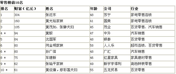 今年“胡潤零售富豪榜”的前三甲風(fēng)采依舊。在國美上演激烈的權(quán)利爭奪大戰(zhàn)的一年里,蘇寧電器的張近東以財富304億元的絕對優(yōu)勢穩(wěn)坐首富寶座。國美的黃光裕在激烈的權(quán)利爭奪戰(zhàn)中保持第二位,財富160億元。茂業(yè)集團的黃茂如、張靜夫婦在穩(wěn)步發(fā)展中以105億元繼續(xù)位居第三。