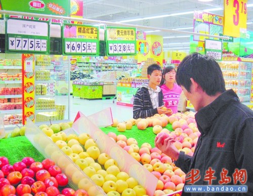 10月26日上午,在家樂福超市挑選蘋果的張明尊老人看著標(biāo)牌上“7.38元/斤”的標(biāo)價(jià),不禁感慨。記者從批發(fā)市場了解到,今年紅富士不僅零售價(jià)漲了,批發(fā)價(jià)也比去年同期高出三成左右。